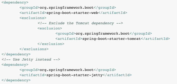 위와 같이 tomcat을 exclusion시켜주고 jetty의존성을 주입하게 되면 컨테이너로 jetty를 사용할 수 있다.