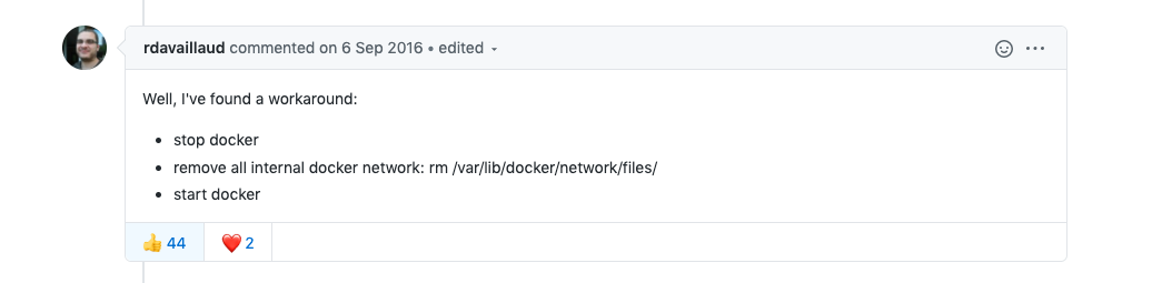 뭔가 네트워크적인 이슈가 있다고 판단 구글링을 해서 본 docker 디렉토리 밑의 network/files를 날려보기로 결심...(너무 무서워서 알파 환경에서 먼저 시도해보았다. 이래서 리얼환경과 동일한 알파환경은 꼭 필요하다.)