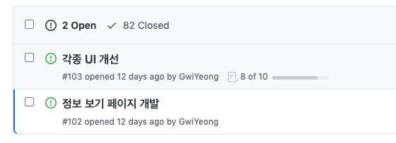 이슈를 만들 때 커스텀 라벨(label)도 만들어 사용하였습니다. 해당 이슈가 기존 기능을 보완하는 이슈인지 새로운 기능을 개발하는 이슈인지 라벨만 보고도 알 수 있습니다.