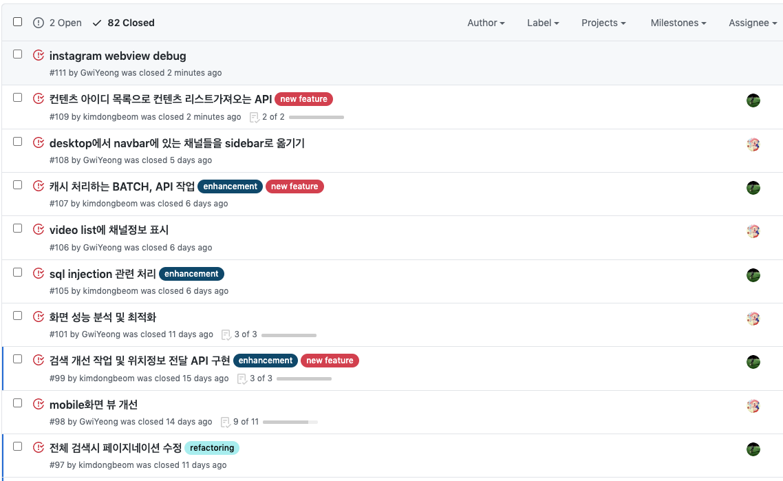 저희는 협업을 위한 툴로 Git을 사용하였고 개발하기전 모든 기능 개발에 대한 Issue를 발행하고 각자가 맡은 기능들은 해당 feature에 개발한 후 검토하고 Merge하는 방식으로 진행하였습니다. 개리는 프론트 쪽을 진행하였고 저는 백엔드 쪽을 진행하였기에 각자가 맡은 Feature을 Merge할 때에 크게 충돌이 나거나 하는 문제는 발생하지 않았습니다. 약 1년 동안 84개의 Issue를 등록하였고 그 중 82개가 Closed된 상태입니다.