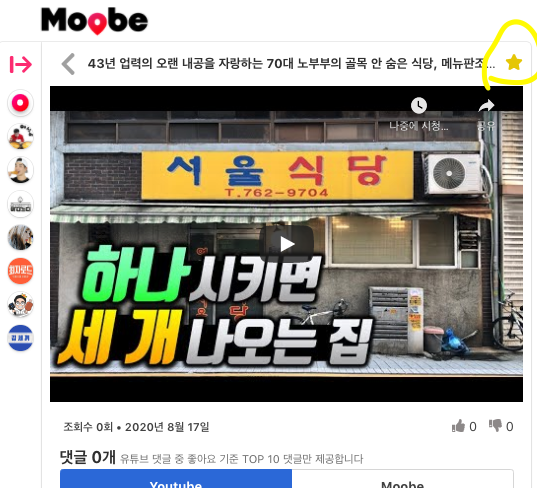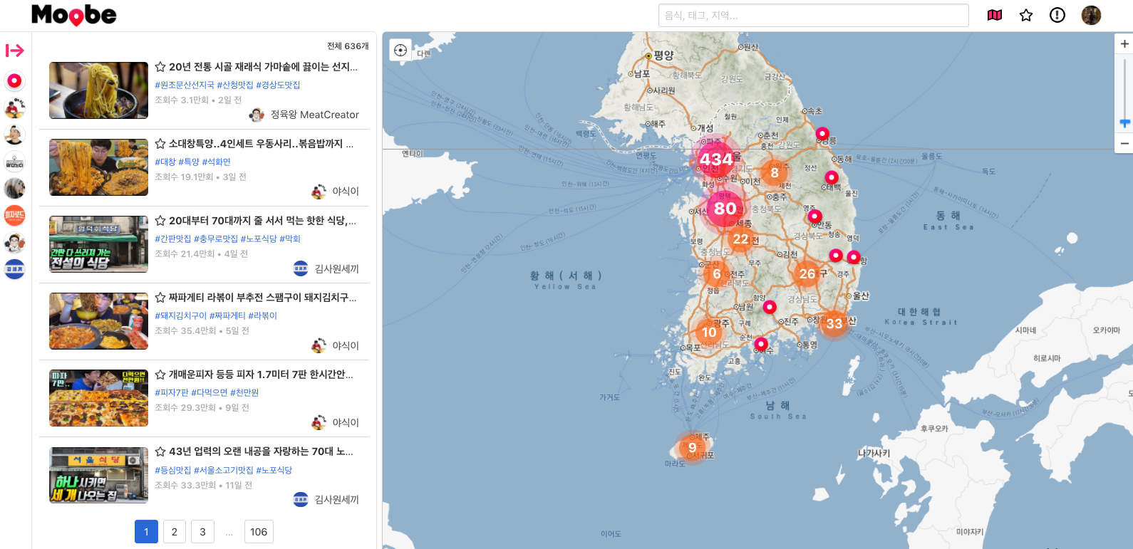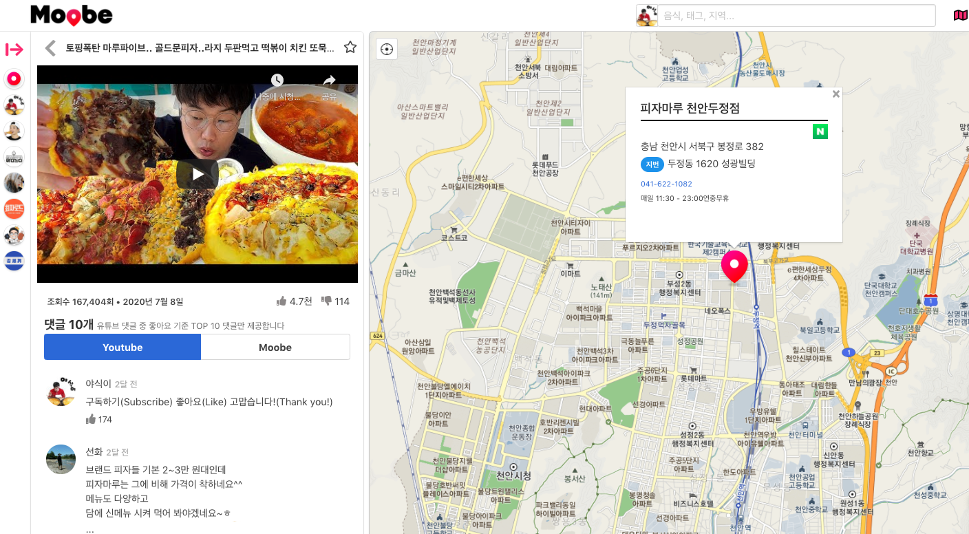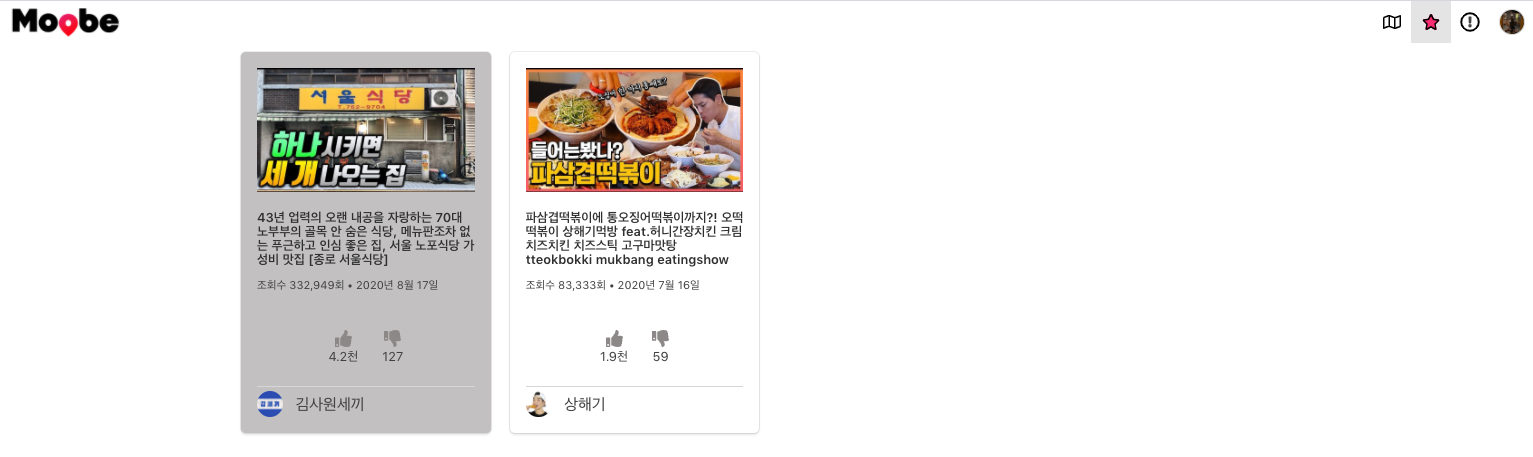 일단 젤 왼쪽을 보면 Moobe서비스에 등록된 맛집 유튜버들의 채널 목록이 보인다.