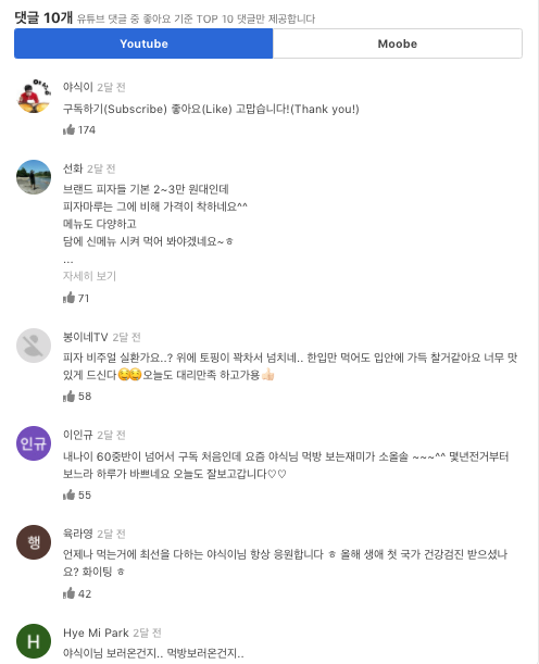 유튜브에서 달린 댓글들중 '좋아요'가 가장 많이 달린 TOP10에 대한 댓글 보기도 제공한다.