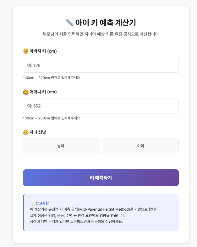 부모님의 키를 입력하면 자녀의 예상 키를 유전 공식으로 계산합니다. 성장 백분위, 성장 팁, 부모와의 키 차이까지 무료로 확인하세요.